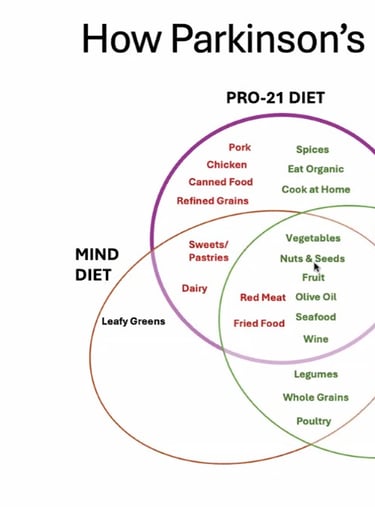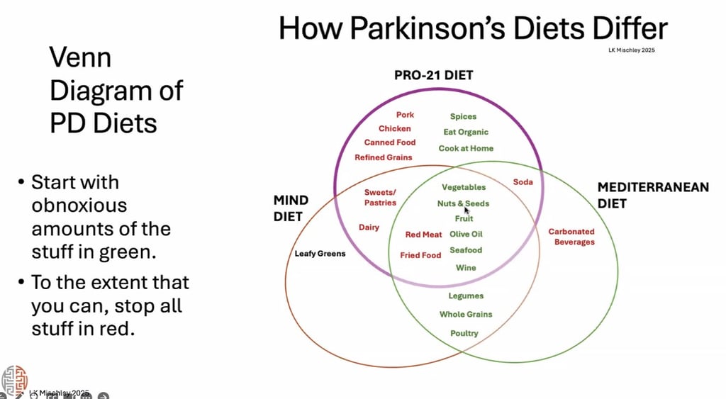 For individuals with Parkinson's disease, a balanced diet rich in fruits, vegetables, whole grains, and lean protein is recommended, with attention to potential medication interactions and managing common symptoms like constipation.